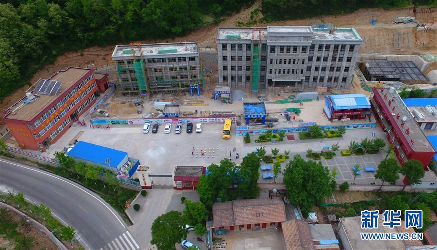 俯瞰陕西照金北梁红军小学(5月27日无人机拍摄)。新建的综合教学楼和学生宿舍楼已经封顶,今年9月就能投入使用。 新华社记者 梁爱平 摄