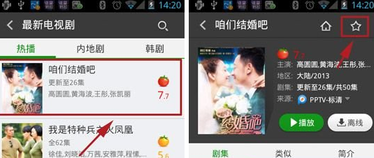 2)除了看精选的电视剧或电影外我们还可以收藏至收藏夹,下面小编以现在的热播剧咱们结婚吧为例,打开后点击右下角的星星标示可以收藏该电视剧,还可以离线下载电视剧。