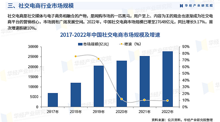 社交电商是社交媒体与电子商务相融合的产物,是网购市场的一匹黑马,用户至上、内容为王的观念也逐渐成为社交电商平台的营销核心,市场拥有广阔发展空间。2022年,中国社交电商市场规模已增至27648亿元,同比增长9.17%,首次增速跌破10%。