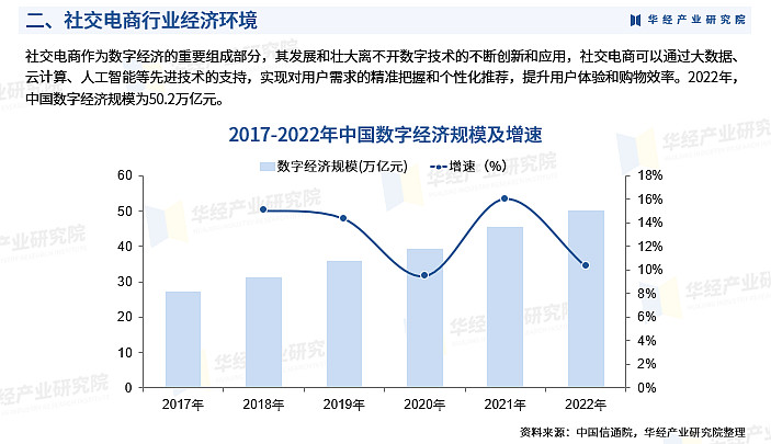 社交电商作为数字经济的重要组成部分,其发展和壮大离不开数字技术的不断创新和应用,社交电商可以通过大数据、云计算、人工智能等先进技术的支持,实现对用户需求的精准把握和个性化推荐,提升用户体验和购物效率。2022年,中国数字经济规模为50.2万亿元。
