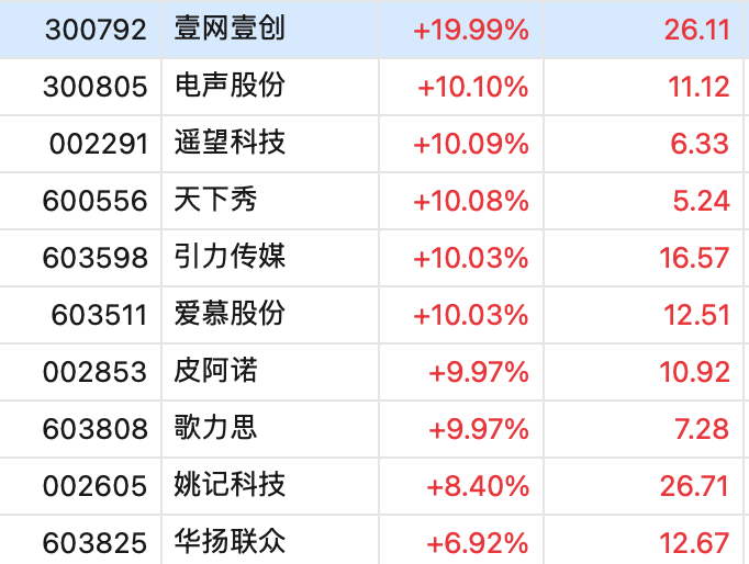 受上述消息影响,小红书概念股集体走强,壹网壹创20CM涨停,电声股份、遥望科技、天下秀等多股涨停,华扬联众、姚记科技等涨幅靠前。