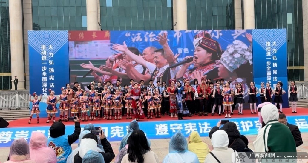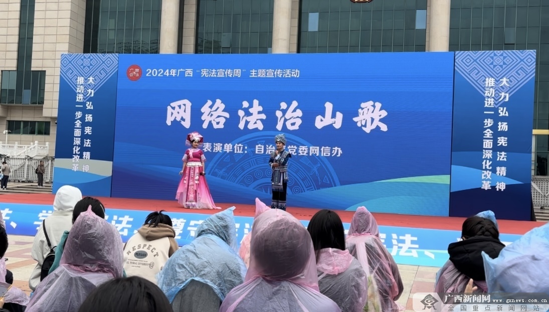 广西新闻网南宁12月7日讯(记者 谭晓林)12月7日,正值全国第七个“宪法宣传周”,为大力弘扬宪法精神,维护宪法权威,由自治区党委宣传部、自治区党委网信办、自治区司法厅主办,南宁市司法局承办的2024年广西“宪法宣传周”主题宣传活动在南宁市民族广场举行。区直、市直落实普法责任制的17个单位通过搭设法律咨询台、发放法律宣传资料及开展法律知识有奖问答等方式,向来往群众宣传宪法基本知识、宪法与日常生活的密切联系以及如何遵守和拥护宪法等内容。 活动现场气氛热烈,群众热情高涨。记者 谭晓林 摄制 现场精彩的法治文艺演出,将“法治+民族文化”元素深度融合,《侗韵锦绣》《呗侬学法歌》《宪法山歌润壮乡》《网络法治山歌》《法润少年》《宪法之歌》等节目尽显民族边疆特色,用艺术的形式生动诠释了宪法精神,用群众喜闻乐见的方式传递法治信仰。现场气氛热烈,观众情绪高涨。