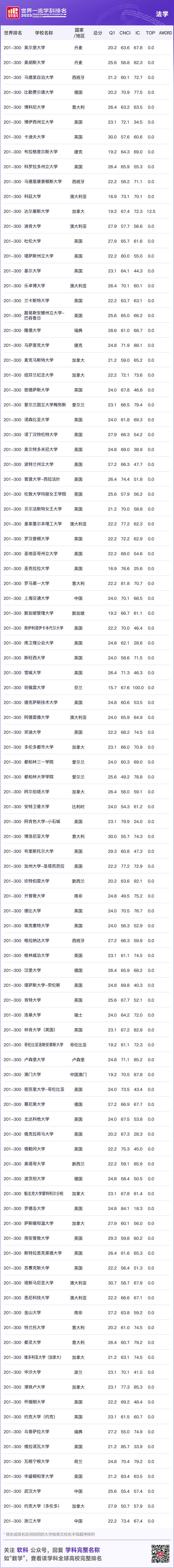 法学学科排名中,全球共有300所高校上榜,排名全球前5的高校依次为耶鲁大学、哈佛大学、宾夕法尼亚大学、芝加哥大学、纽约大学。