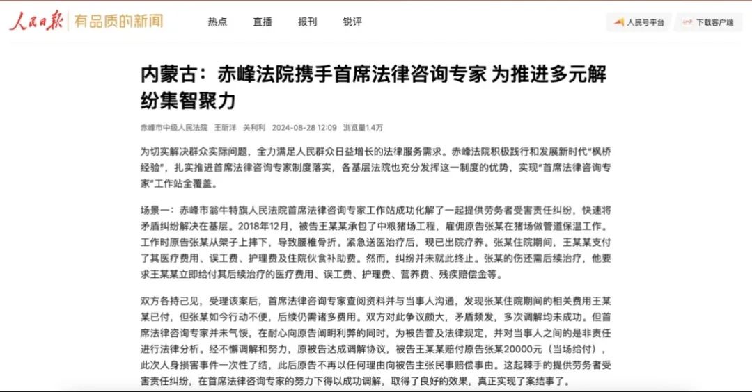 原标题:《【媒体关注】人民日报客户端丨赤峰法院携手首席法律咨询专家 为推进多元解纷集智聚力》