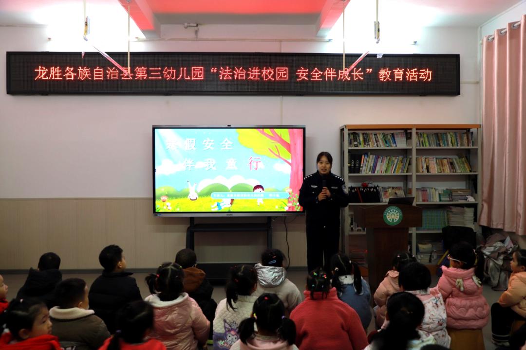 随着寒假的到来,小朋友们即将迎来一段美好的假期时光。为了让孩子们进一步提高法治意识和自我保护能力,度过一个愉快而安全的假期,龙胜各族自治县人民法院两位幼儿园法治副园长伍飞、阳冬莲分别进入县第一、第三幼儿园开展法治安全进校园活动,用实际行动为孩子们的健康成长保驾护航。