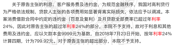 在部分法院判决中,捷信主张超过24%的费用也未被支持。以山东省济南市市中区人民法院的判决书为例,2019年12月11日,该法院支持捷信要求被告偿还所欠贷款本金的诉讼请求,但认定消费借款合同中约定的违约金(罚息及复利)及月贷款全部费率已超过年利率24%,对捷信主张的超过年利率24%的部分不予支持。