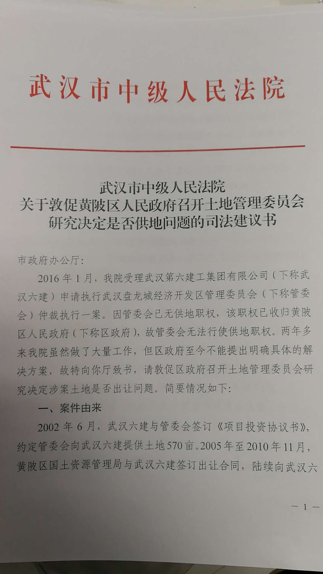 黄陂滠口经济发展区2003年更名为武汉盘龙城经济开发区,黄陂第六建筑有限公司后来也更名为武汉第六建工集团有限公司。协议约定的是出让400亩,但到2010年,政府只为其办理了200多亩的土地和规划手续。双方出现供地纠纷,按照协议约定,提请武汉仲裁委员会仲裁。2015年12月,武汉六建打赢了官司,但遭遇执行难。目前,武汉市中院已三次发出敦促履行的通知书,最高法院也督办两次,武汉市委政法委也召开了专题会议,要求黄陂区政府尽快依法行政,但黄陂区政府仍未履行生效裁定。黄陂区政府主管副区长丁朝辉称,中国之声的报道播出后,区里第一时间开了专题会议。黄陂区委区政府非常重视,书记和区长都亲自参加了专题会议。区政府的相关负责人和盘龙城开发区的主要负责人约见了六建公司的法人代表,双方进行了坦诚和务实地交流。