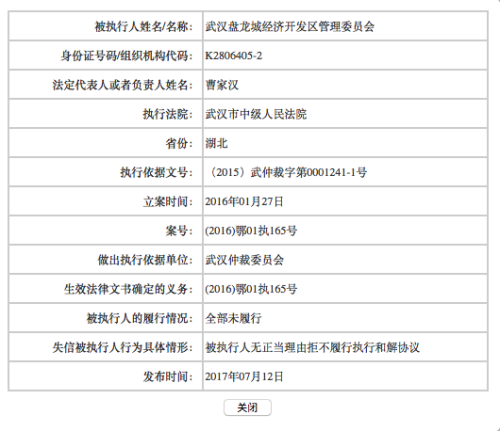 湖北省委巡视组已经介入此案的执行。2017年7月12日,武汉市中院就将盘龙城经开区管委会和其法人代表曹家汉列入失信被执行人名单。武汉市中院方面表示,不排除刑拘曹家汉的可能。一位法律界人士指出,法院仍有限制被执行人高消费、拘留法定代表人和直接责任人,以及按照拒不执行法院判决裁定罪问责等强制措施没有实施。