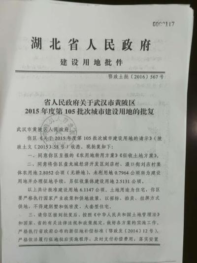 记者调查发现,虽然案涉地块2016才被湖北省政府批复,由农用地变更土地性质为建设用地,但早在2002年,当地政府就将这块土地交由武汉六建开发,并让武汉六建完成了“三通一平”(指基本建设项目开工的前提条件)和缴纳了征地补偿费用。盘龙城经开区管委会副主任胡莉萍解释称,当时他们在履行这个协议,里面涉及到征地这一块的工作,要与农民对接,他们协助他做相关的工作。按照国家的相关政策,土地是要进行补偿的。
