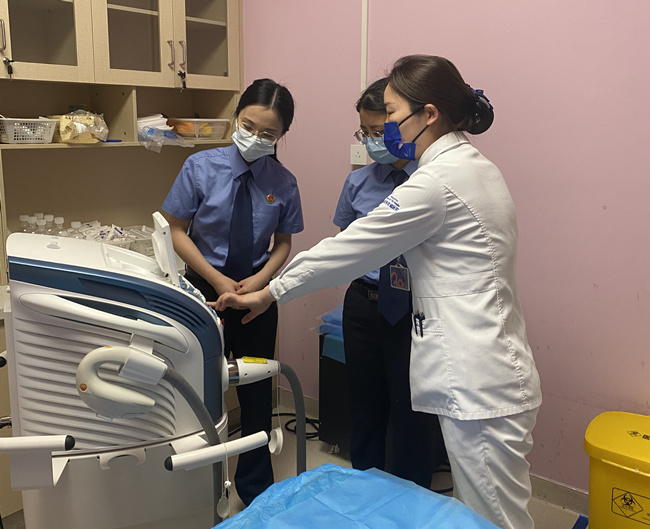余杭区检察院办案检察官在辖区一家医疗美容机构调查取证。