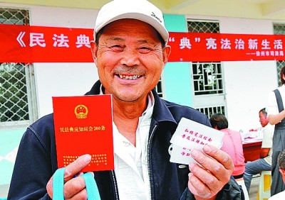 图③:江苏徐州市贾汪区塔山镇殷庄村村民在展示市司法局发放的《民法典应知应会200条》。王应举摄/光明图片