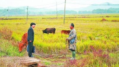 江西贵溪市人民法院泗沥人民法庭法官周淑琴(左)向尹家村村民了解情况。新华社发