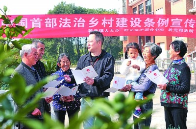 图①:浙江湖州市德清县乾元镇金火村,法律工作者向村民解读我国首部法治乡村建设条例——《湖州市法治乡村建设条例》。倪立芳摄/光明图片