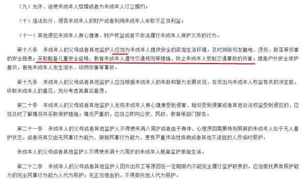 在国家新交规中,规定了4岁以下儿童必须使用儿童安全座椅,而12岁以下的儿童是不能够坐副驾驶上。另外,已在2021年6月1日正式实施的新修订《未成年人保护法》中,也明确规定“采取配备儿童安全座椅、教育未成年人遵守交通规则等措施,防止未成年人受到交通事故的伤害”。