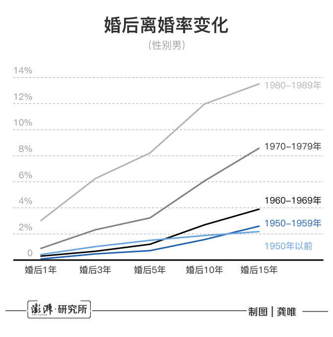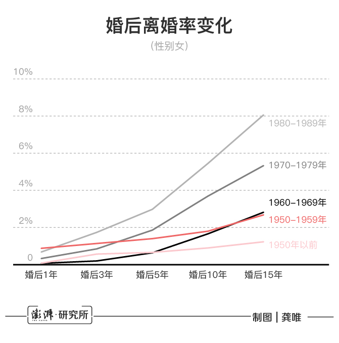 总的来说,1970前出生的离婚率比较低。相比之下,70后的离婚率开始出现上升,80后的离婚率又进一步明显上升。