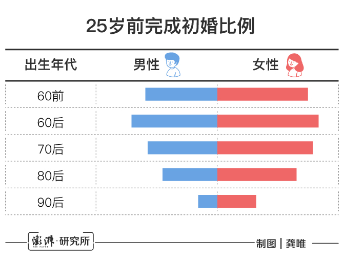 1960年以前出生的世代,约70%的男性会在25岁以前完成初婚。女性平均来说要比男性更早地进入婚姻。在1960年以前和60后、70后中,有超过80%的女性会在25岁以前完成初婚。
