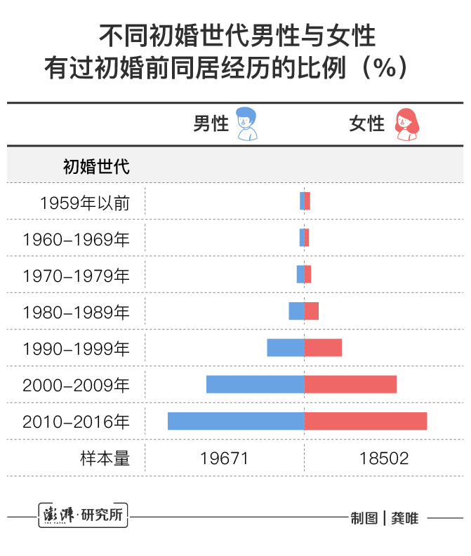 婚前同居行为在年轻人中变得越来越普遍。越是年轻的世代,有过婚前同居经历的人口比例就越高。