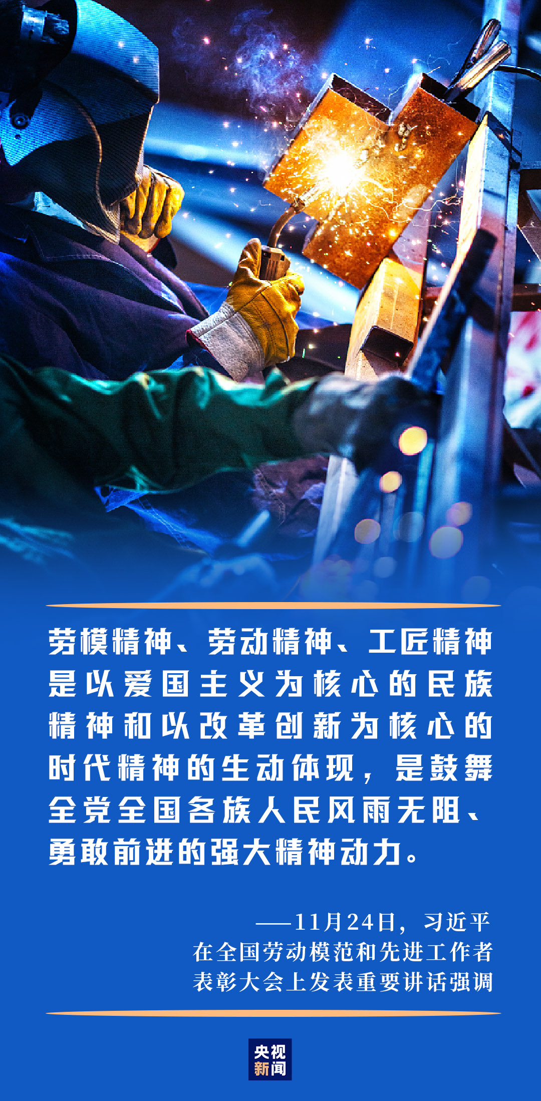 11月24日上午,习近平总书记在全国劳动模范和先进工作者表彰大会上发表重要讲话,点赞劳动模范是民族的精英、人民的楷模,是共和国的功臣,赞扬工人阶级和广大劳动群众用智慧和汗水谱写了“中国梦·劳动美”的新篇章,鼓舞全党全国各族人民大力弘扬劳模精神、劳动精神、工匠精神,在全面建设社会主义现代化国家新征程上创造新的时代辉煌。