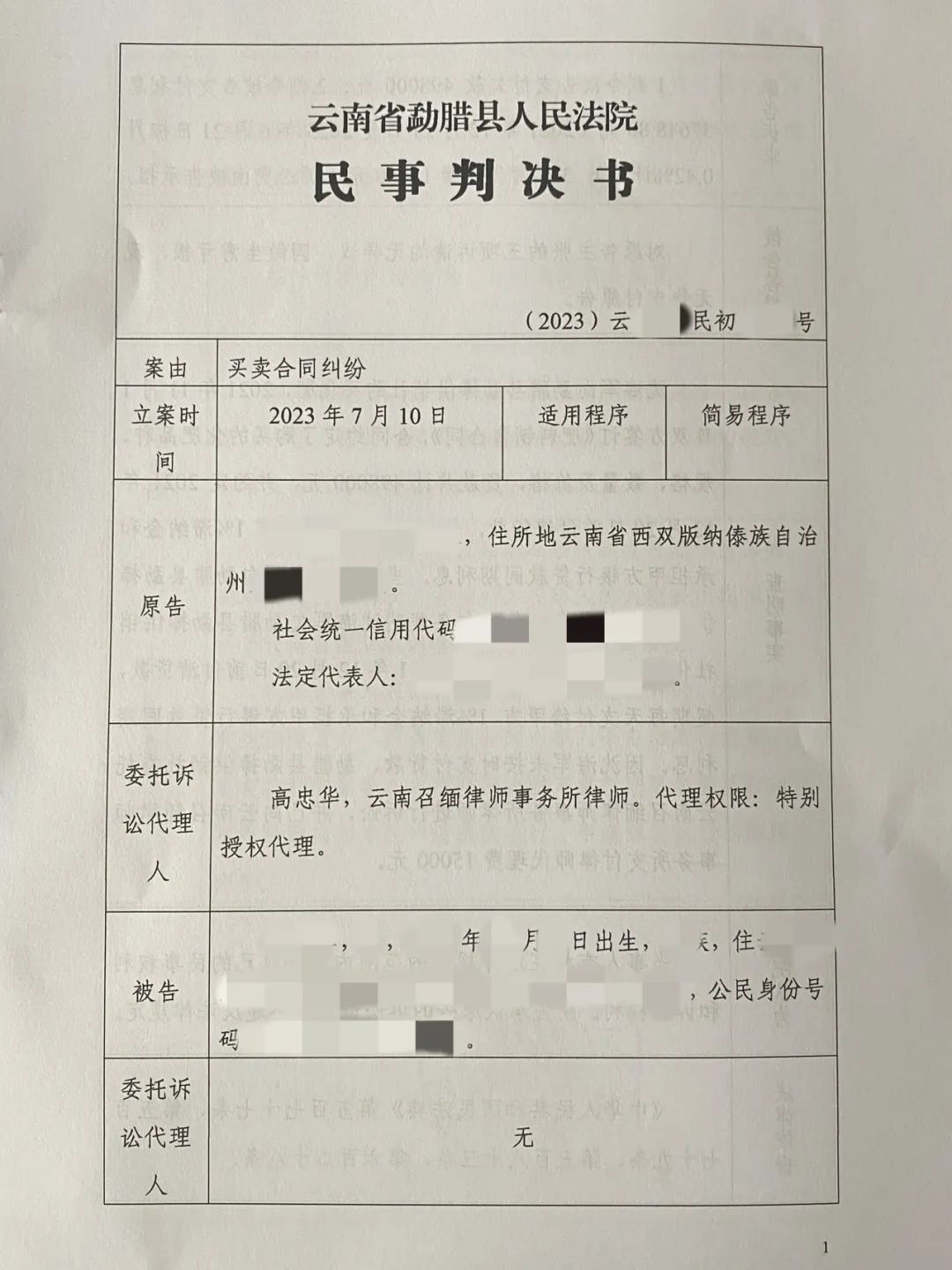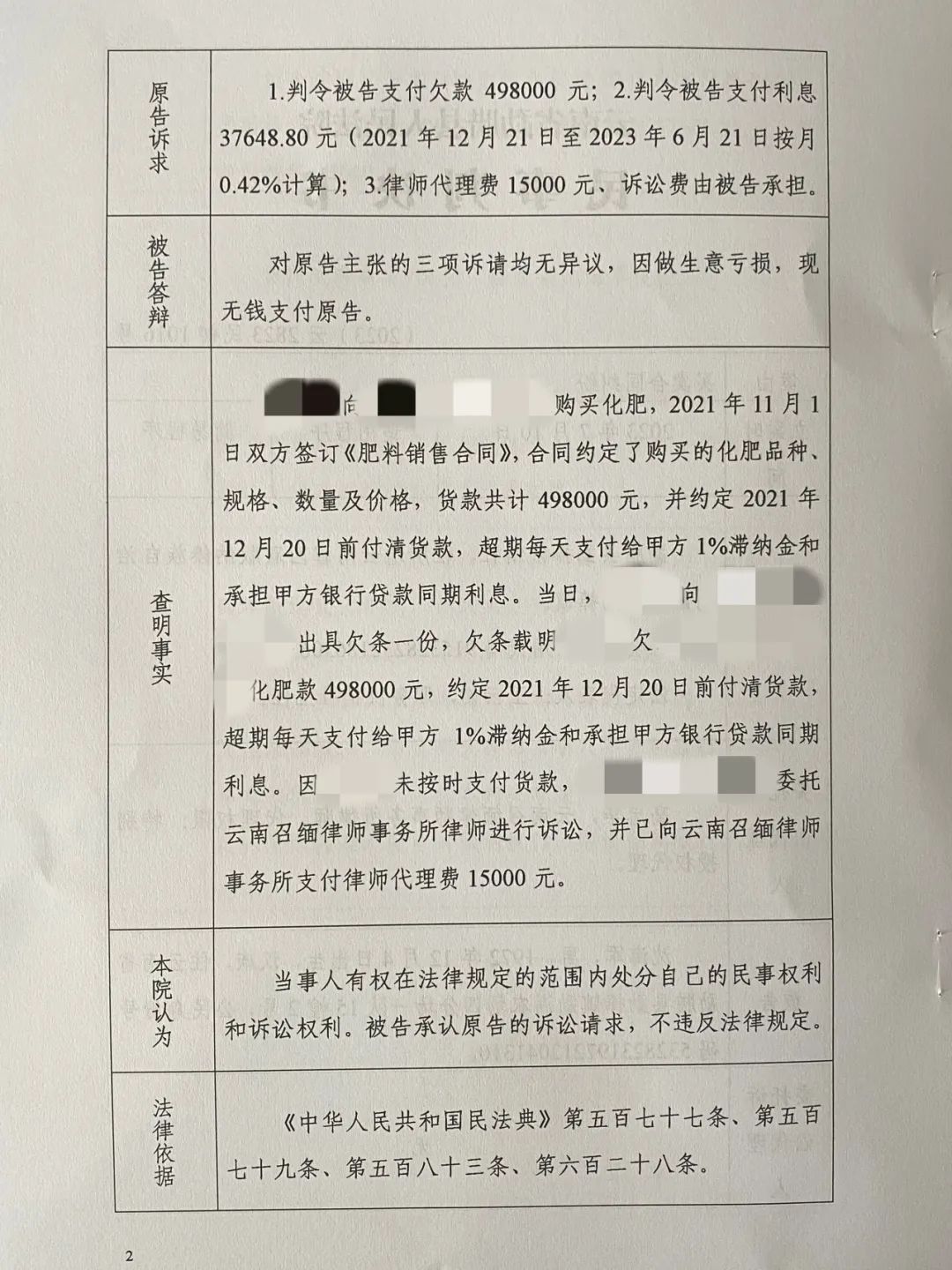 近期,勐腊县人民法院适用简易程序审理了一起买卖合同纠纷案件,在该起案件中,沈某某向某供销社购买化肥,2021年11月1日双方签订《肥料销售合同》,合同约定了购买的化肥品种、规格、数量及价格,货款共计498000元,并约定2021年12月20日前付清货款,签订合同之后,沈某某未按约定付款,供销社诉至法院,要求沈某某支付货款及利息、律师代理费15000元。
