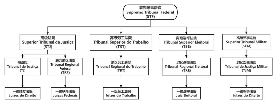 根据巴西联邦宪法的规定,联邦法院的职责是审理涉及联邦法律或公共利益的案件,而州法院则负责处理其管辖范围内与联邦法律无关的案件。每个州都依据自己的宪法来组织司法系统和确定其管辖权。[5]