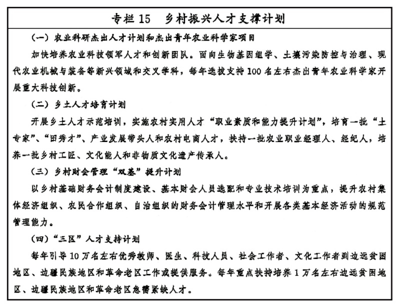 加大“三农”领域实用专业人才培育力度,提高农村专业人才服务保障能力。加强农技推广人才队伍建设,探索公益性和经营性农技推广融合发展机制,允许农技人员通过提供增值服务合理取酬,全面实施农技推广服务特聘计划。加强涉农院校和学科专业建设,大力培育农业科技、科普人才,深入实施农业科研杰出人才计划和杰出青年农业科学家项目,深化农业系列职称制度改革。