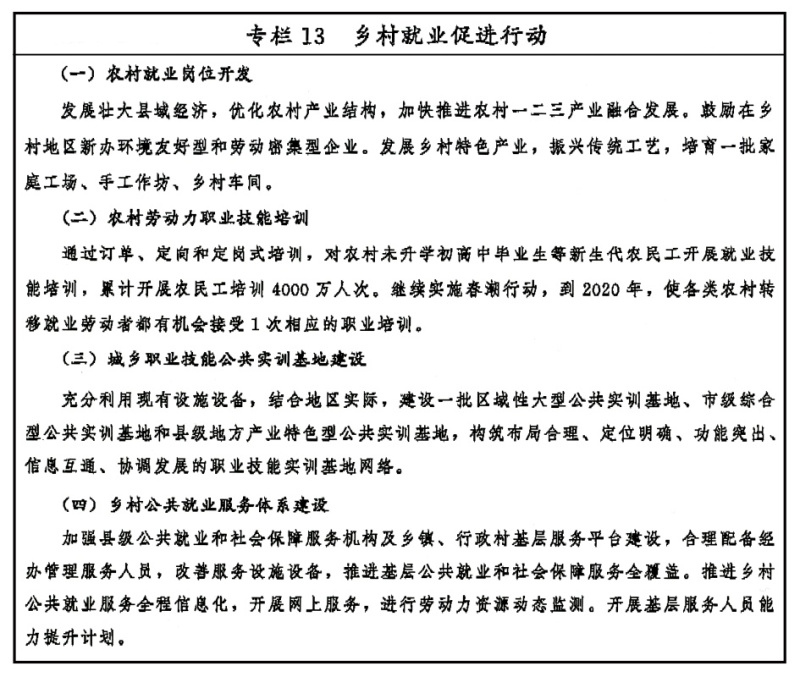 健全覆盖城乡的公共就业服务体系,提供全方位公共就业服务。加强乡镇、行政村基层平台建设,扩大就业服务覆盖面,提升服务水平。开展农村劳动力资源调查统计,建立农村劳动力资源信息库并实行动态管理。加快公共就业服务信息化建设,打造线上线下一体的服务模式。推动建立覆盖城乡全体劳动者、贯穿劳动者学习工作终身、适应就业和人才成长需要的职业技能培训制度,增强职业培训的针对性和有效性。在整合资源基础上,合理布局建设一批公共实训基地。