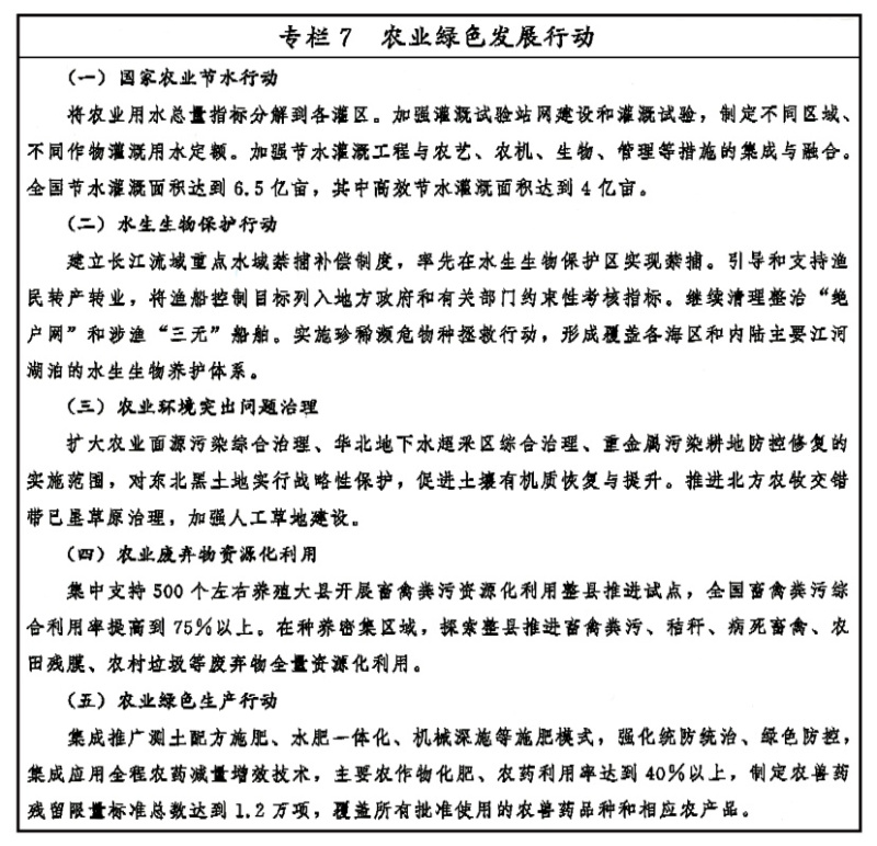 实施国家农业节水行动,建设节水型乡村。深入推进农业灌溉用水总量控制和定额管理,建立健全农业节水长效机制和政策体系。逐步明晰农业水权,推进农业水价综合改革,建立精准补贴和节水奖励机制。严格控制未利用地开垦,落实和完善耕地占补平衡制度。实施农用地分类管理,切实加大优先保护类耕地保护力度。降低耕地开发利用强度,扩大轮作休耕制度试点,制定轮作休耕规划。全面普查动植物种质资源,推进种质资源收集保存、鉴定和利用。强化渔业资源管控与养护,实施海洋渔业资源总量管理、海洋渔船“双控”和休禁渔制度,科学划定江河湖海限捕、禁捕区域,建设水生生物保护区、海洋牧场。