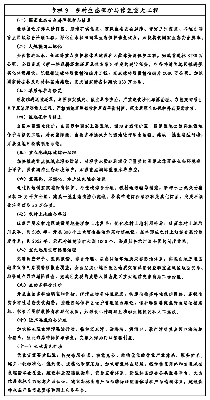 统筹山水林田湖草系统治理,优化生态安全屏障体系。大力实施大规模国土绿化行动,全面建设三北、长江等重点防护林体系,扩大退耕还林还草,巩固退耕还林还草成果,推动森林质量精准提升,加强有害生物防治。稳定扩大退牧还草实施范围,继续推进草原防灾减灾、鼠虫草害防治、严重退化沙化草原治理等工程。保护和恢复乡村河湖、湿地生态系统,积极开展农村水生态修复,连通河湖水系,恢复河塘行蓄能力,推进退田还湖还湿、退圩退垸还湖。大力推进荒漠化、石漠化、水土流失综合治理,实施生态清洁小流域建设,推进绿色小水电改造。加快国土综合整治,实施农村土地综合整治重大行动,推进农用地和低效建设用地整理以及历史遗留损毁土地复垦。加强矿产资源开发集中地区特别是重有色金属矿区地质环境和生态修复,以及损毁山体、矿山废弃地修复。加快近岸海域综合治理,实施蓝色海湾整治行动和自然岸线修复。实施生物多样性保护重大工程,提升各类重要保护地保护管理能力。加强野生动植物保护,强化外来入侵物种风险评估、监测预警与综合防控。开展重大生态修复工程气象保障服务,探索实施生态修复型人工增雨工程。