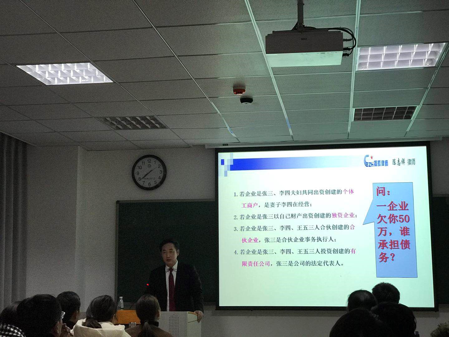 陈律师分享了中国民营企业的主要组织形式,深入浅出的分析了每一种组织形式的特点和不同的责任范围,并对企业可能面临的各方面风险画了重点,包括合伙人、股东的法律风险、企业的客户风险、签订和履行合同的风险及员工风险等。陈律师尤其提醒大家,在拟定合同时要尽可能详尽,尽可能不产生歧义,以避免可能遇到的法律风险;处理好家庭、亲友关系,也是防范法律风险的重要方面。
