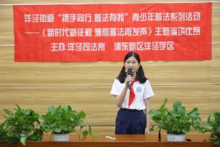 2023年,洋泾举办“普法有我,携手同行”青少年主题演讲比赛。与洋泾学区10所学校合作,由各校选送18名中小学生参与比赛。演讲现场,选手们用精彩的表现、声情并茂的才艺、独特的法治体会征服了每一位听众。他们普及法律知识,用少年之声传递党的声音,弘扬法治精神,播撒法治种子。