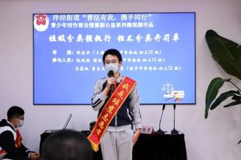 2022年,洋泾开展了“普法有我,携手同行”青少年创作普法情景剧微视频活动。司法所提供网络购物、交通安全、垃圾分类、消防安全等社区热点法律案例,与进才北校、建平西校、环境学校3所学校合作,让学生们自导、自演、自拍、自剪,制作完成10个普法短视频,在社区广泛播放。活动中,学生发挥各自特长,沉浸式参与,全过程普法,受到区校家的一致好评。