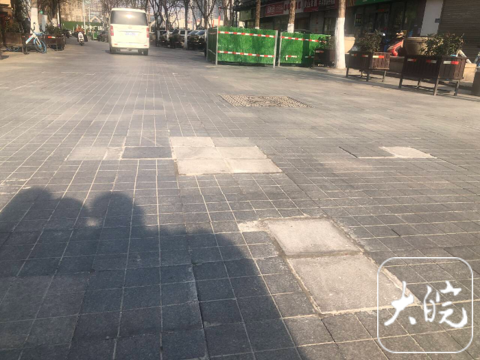 1月30日下午,大皖新闻记者来到明光路与淮浦街交口,从路口沿淮浦街向南走去,与记者上次来探访明显不同的是,一些凹凸的或破损的铺砖都已被修复。记者走到古井丰水源小区东门,此前这里有几处成片铺砖凹陷和破裂损坏的情况,已经都被修复了。