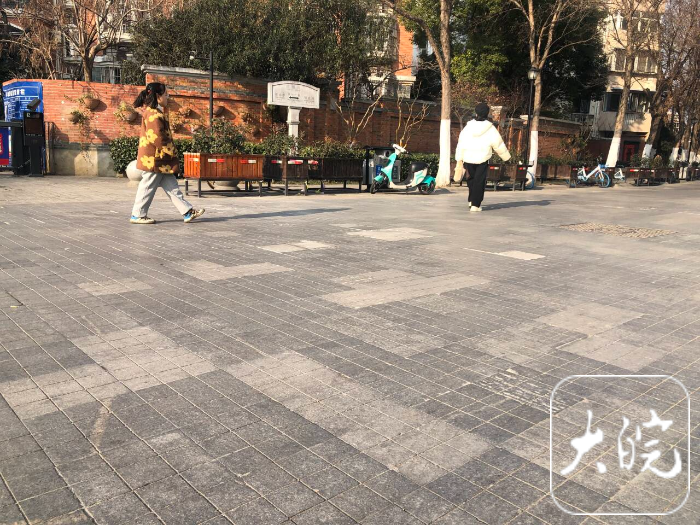 “最初的铺砖颜色较浅,现在看到的颜色泛白的地方基本都是修过的。”现场一位居民指着眼前一片铺砖区域对记者说。记者看到眼前的铺装路面虽然面积不大,但颜色明显不一样的铺砖有十多处,有居民称,部分地方已多次维修,有的铺砖经过一段时间车辆的辗轧,常被轧坏。