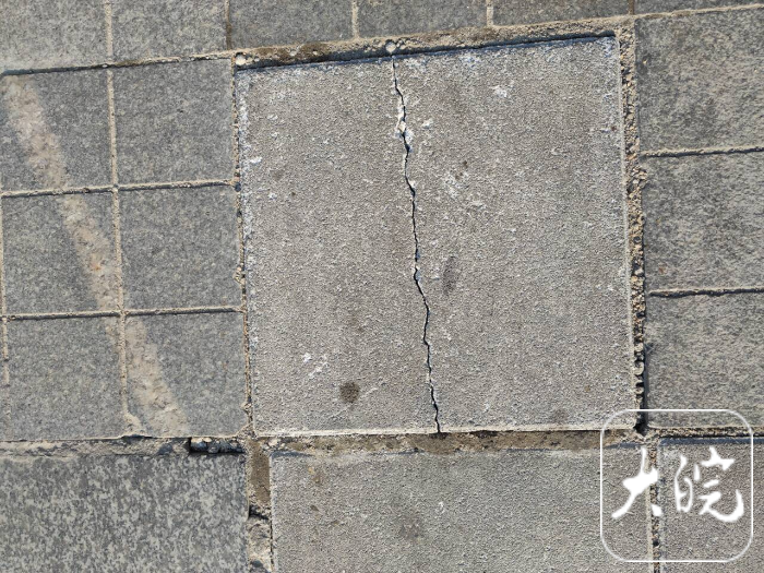 现场有人员带记者来到一处新修好的铺装路面前,可以看到铺砖上有明显的裂痕,现场人员称,修好的铺砖又被轧坏了。