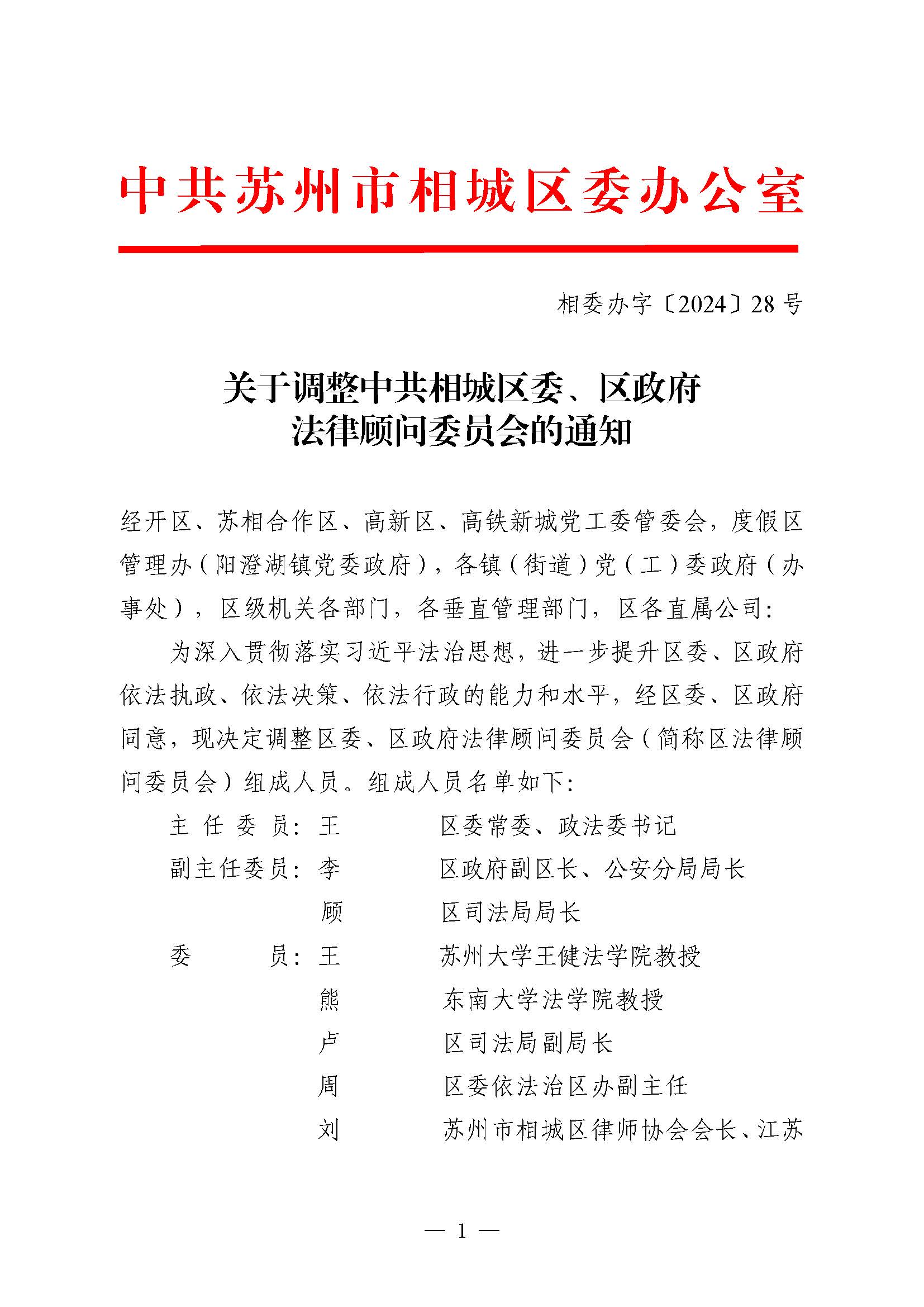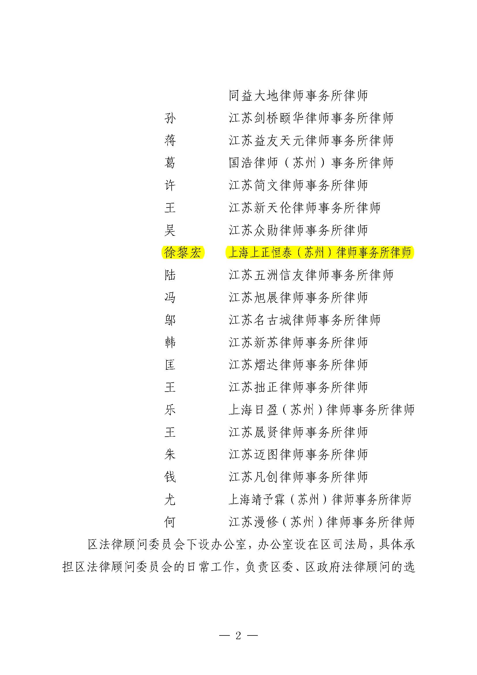 经相城区区委、区政府公开遴选及严格审定,日前,上正恒泰(苏州)律师事务所主任、合伙人徐黎宏律师受聘为新一届区委、区政府法律顾问委员会委员。