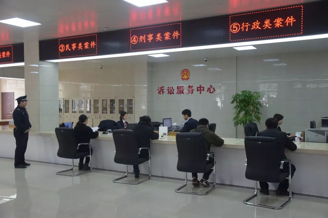 诉讼服务中心设有咨询台、自助立案区、接待室等,各办公区安排得便民合理……