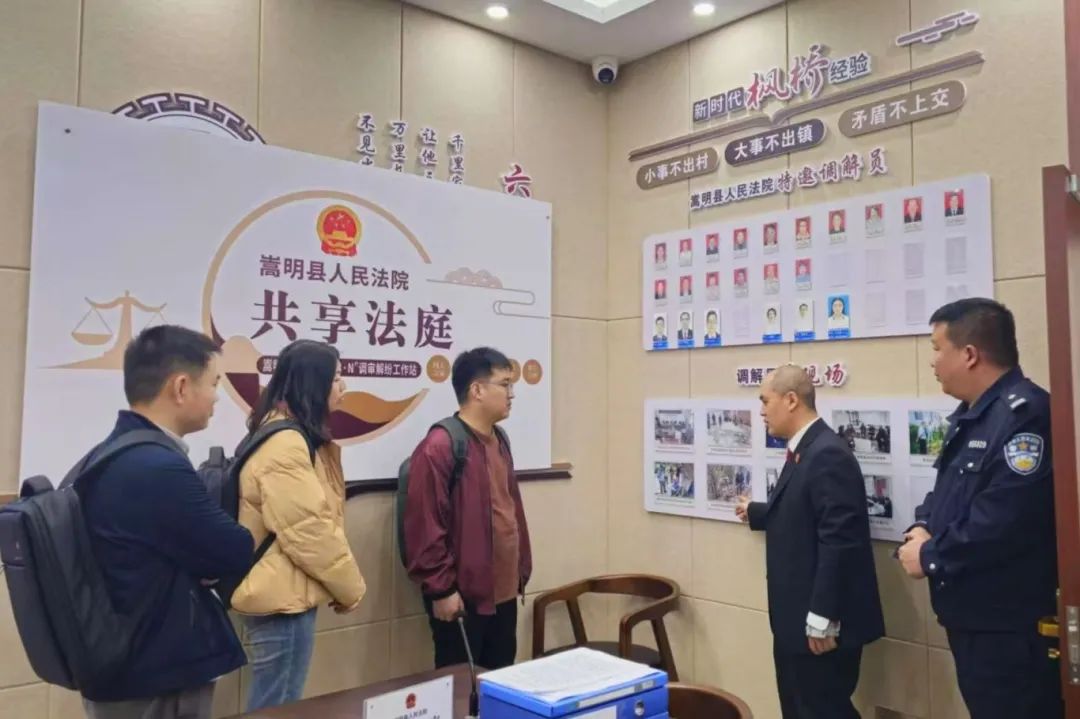 调研首日,师生代表团实地参观了嵩明法院诉讼服务中心、执行事务中心、收扫中心、党建文化长廊、歪家调解室、兰茂调解室等场所,感受法治氛围浓厚的文化建设成果,了解了院校共建开展情况,对嵩法利用地缘优势,与高校建立的人才培养、高校调解模式予以充分认可和高度赞赏。