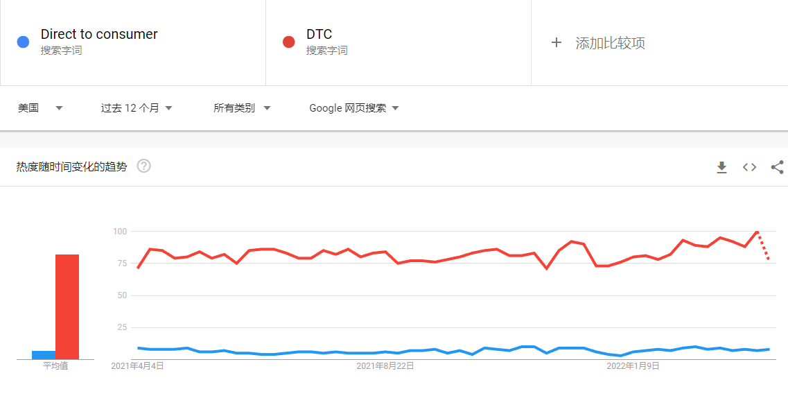 据Google趋势显示,DTC(直面消费者)在过去一年的全球讨论量一直维持在75分以上,热度居高不下。而这一关键词在中国地区的搜索量也在周期性的出现峰值,甚至在2022年初达到了Google趋势评分的100分。