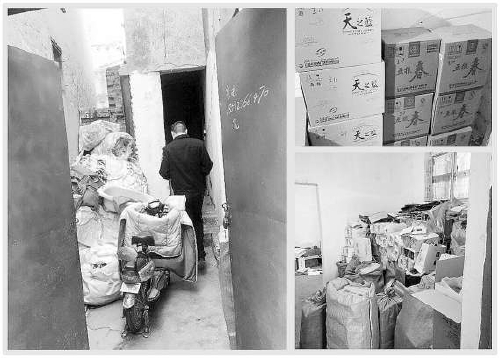 办案人员在王行奎的废品收购站查获的假酒、假冒包装等物品