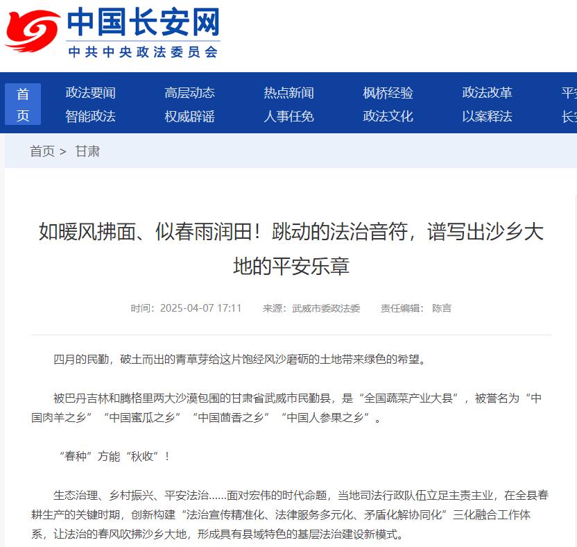 4月7日,中国长安网发布了新闻稿件《如暖风拂面、似春雨润田!跳动的法治音符,谱写出沙乡大地的平安乐章》,现予以转载。