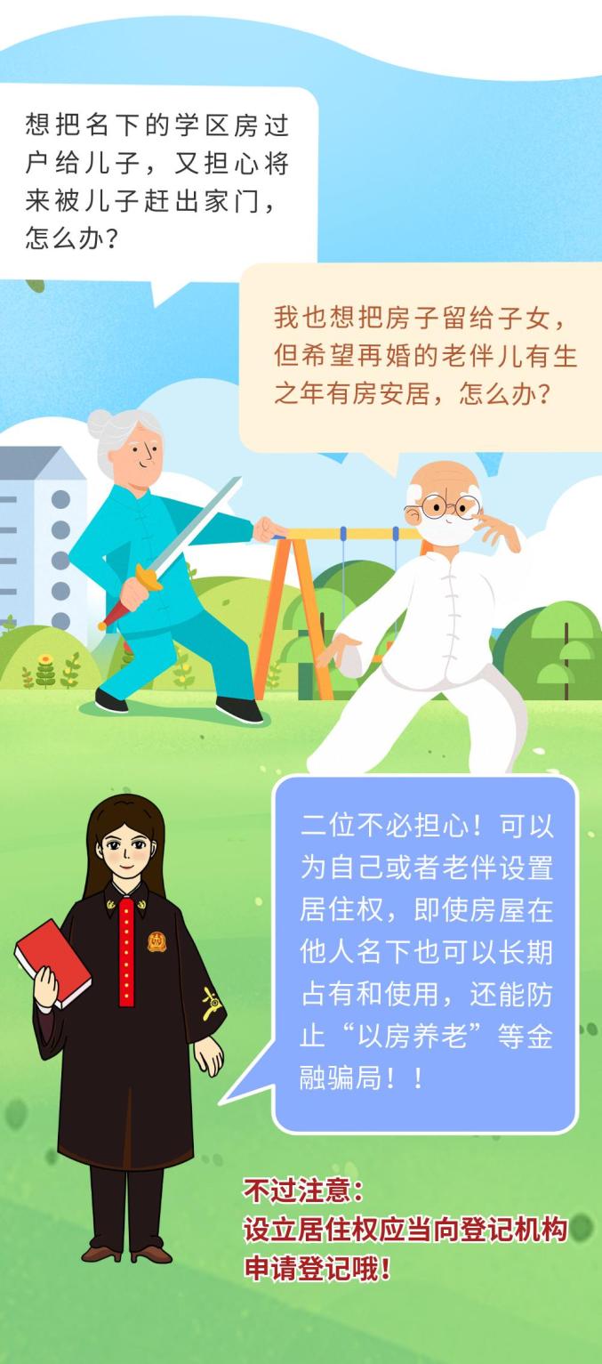 居住权是民法典中新增的制度,主要为赡养、抚养等生活需要而设立。老年朋友们可以通过合同或者遗嘱为自己设立居住权,避免将房屋过户给他人后出现老无所依的担忧。再婚老人可通过为再婚配偶设立居住权,既保证再婚配偶有生之年居有定所,又可以实现后代对房屋的继承,减少家庭纠纷。