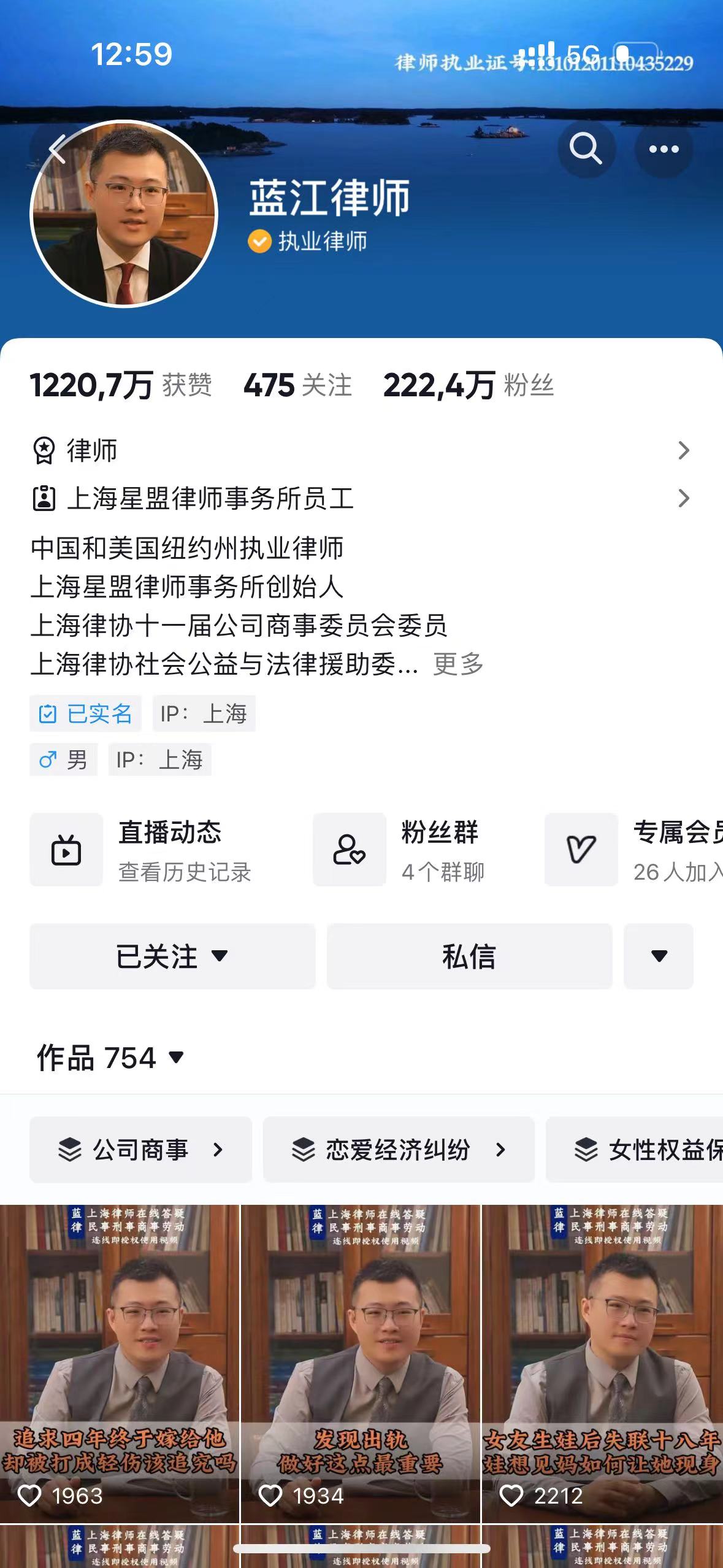他在公众平台上的简历很是闪亮:中国和美国纽约州执业律师、上海星盟律师事务所创始人、上海律协第十一届公司商事委员会委员、上海律协第十二届社会公益与法律援助委员会委员等。他抖音账号@蓝江律师已有粉丝222万人,获赞1200万次。除抖音之外,蓝江律师在视频号、小红书、B站等新媒体平台均拥有同名个人IP账号:蓝江律师,并坚持每日更新普法短视频,力求为更多的老百姓提供公益普法服务。