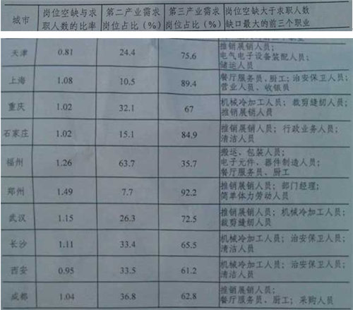 128.2012年第三季度全国十个城市中,第三产业需求岗位数超过第二产业2倍的城市共有: