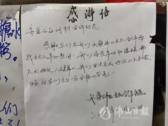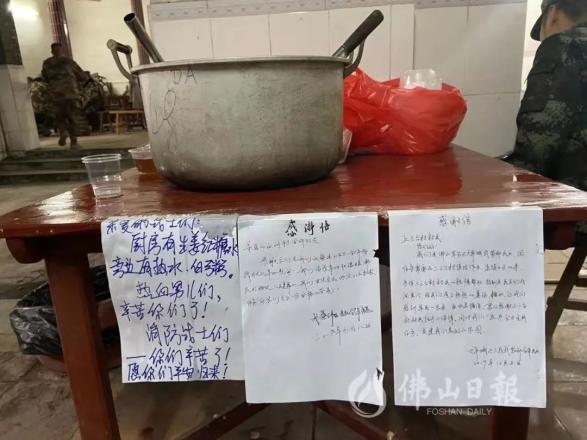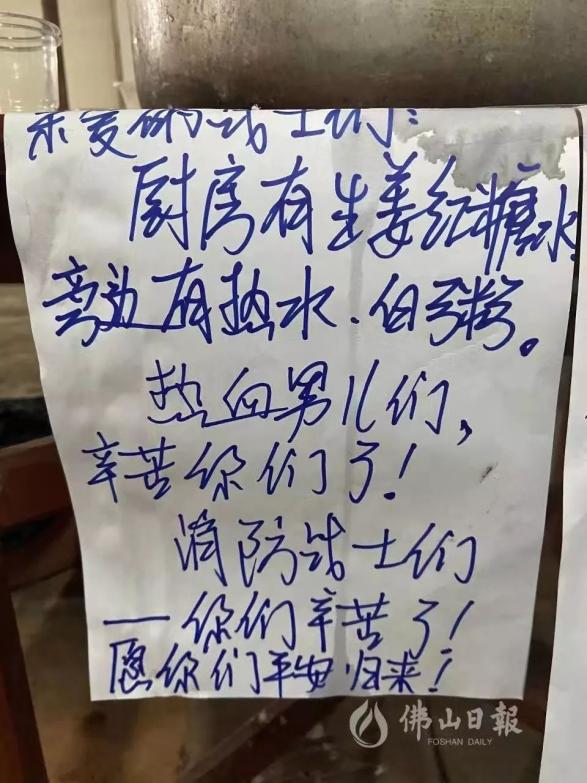 持续作战2天后,消防队员累到站着上睡着,而为防止火场复燃,他们直接在烧过的山上席地而睡。武警佛山支队官兵在石洲执行救火任务时,发现村民已转移在一间无人平房里,贴着一张纸条:“亲爱的战士们,厨房有生姜红糖水,旁边有热水、白粥,辛苦你们了!”临走时,战士们也写下了感谢信。