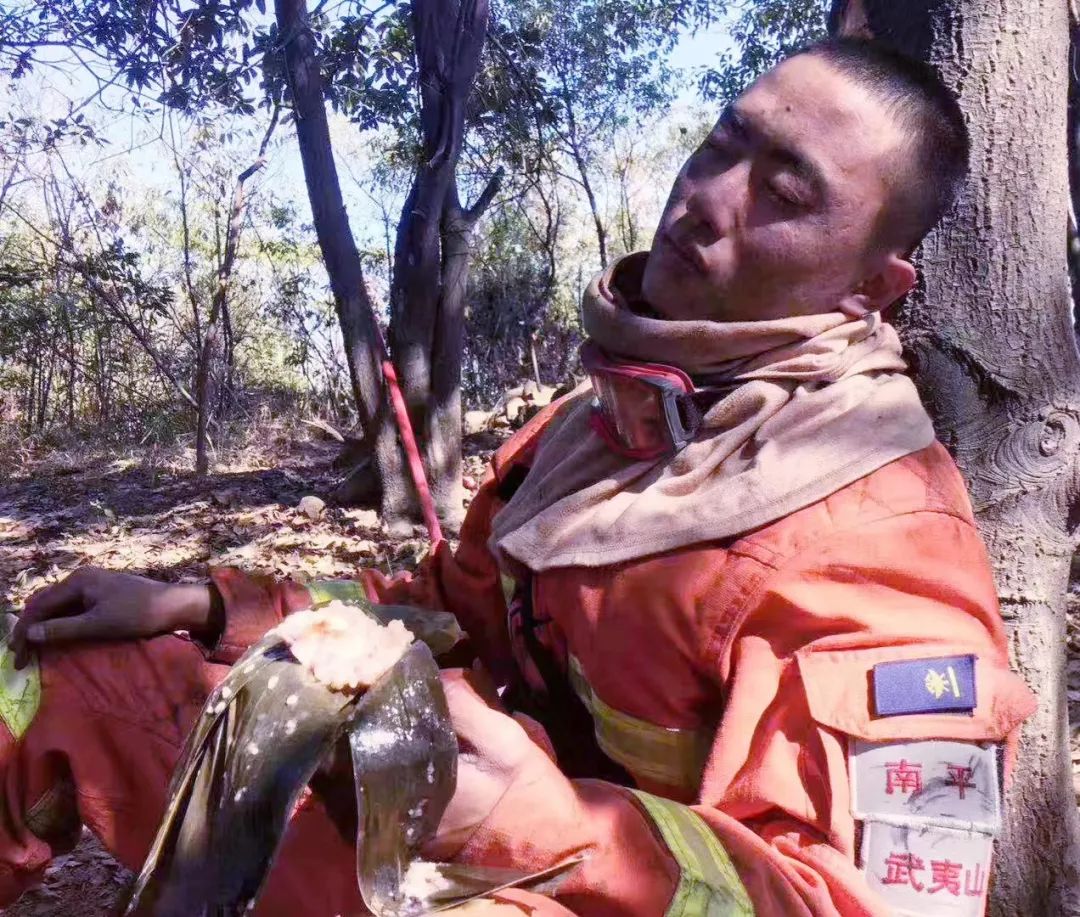 消防战士赵亚州在7日晚赶赴佛山进行灭火战斗后休息不到三小时,8日早又立即投入灭火作战,带领一组队员连续翻越三座山头,筋疲力尽的他左手还举着吃剩下的半个粽子,就靠着大树睡着了。