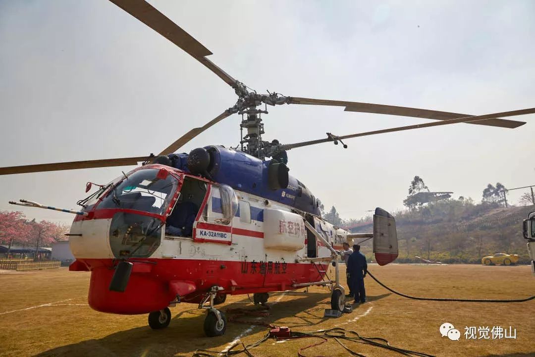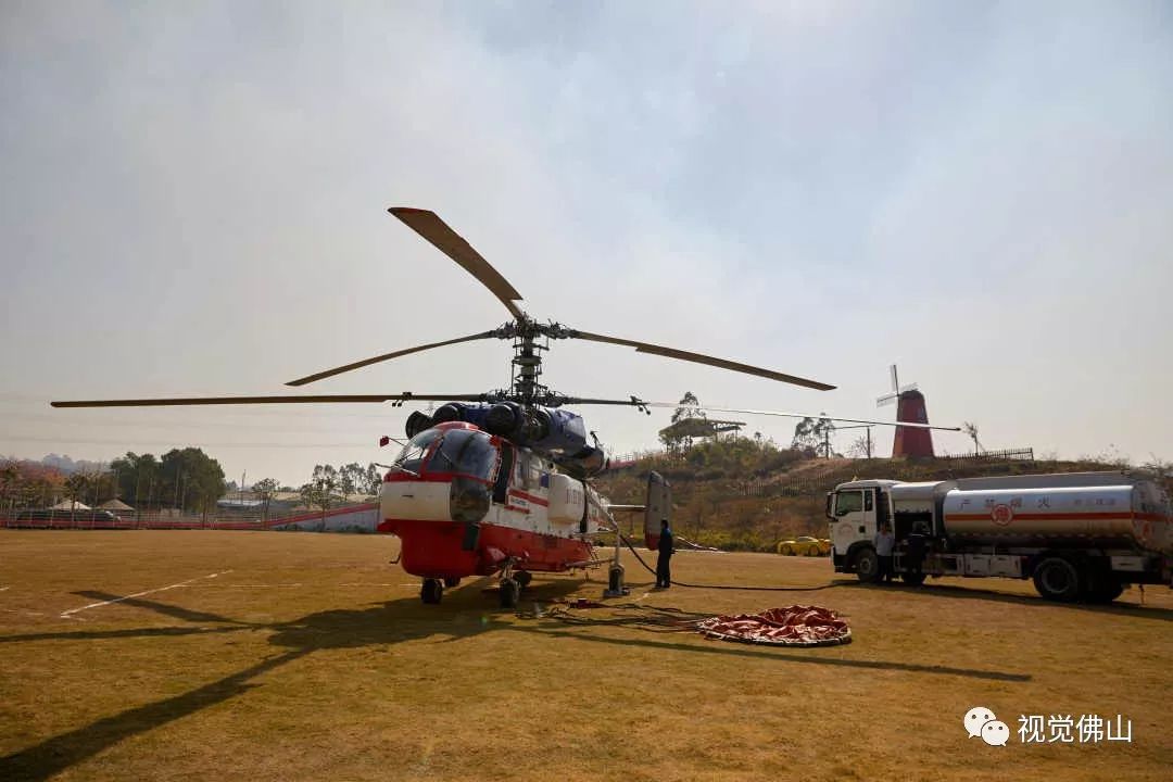 12月7日,山东通航救援队早晨赶到山火现场,在连续灭火数小时后,直升机降落在盈香生态园内进行加油及检修。佛山日报记者吕润致摄