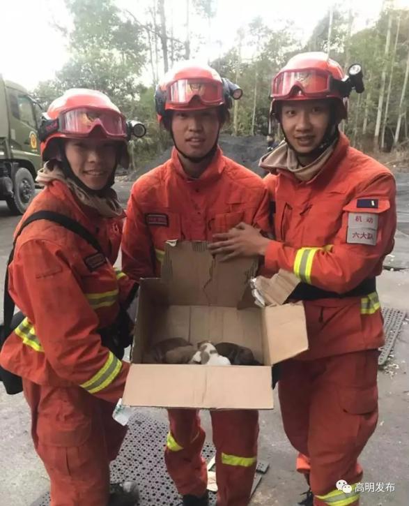 救火过程中,消防员听到有小狗叫的声音。顺着声音找到了趴在草丛中的一窝小狗,消防员连忙把小狗抱在怀里,消除它们因大火带来的恐惧感。