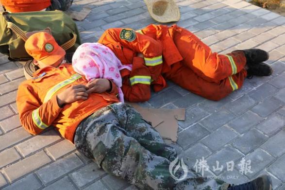 ▲7日下午4点半,从化区森林消防机动中队在上三台村休整,连续工作48小时的他们已经疲惫不堪。