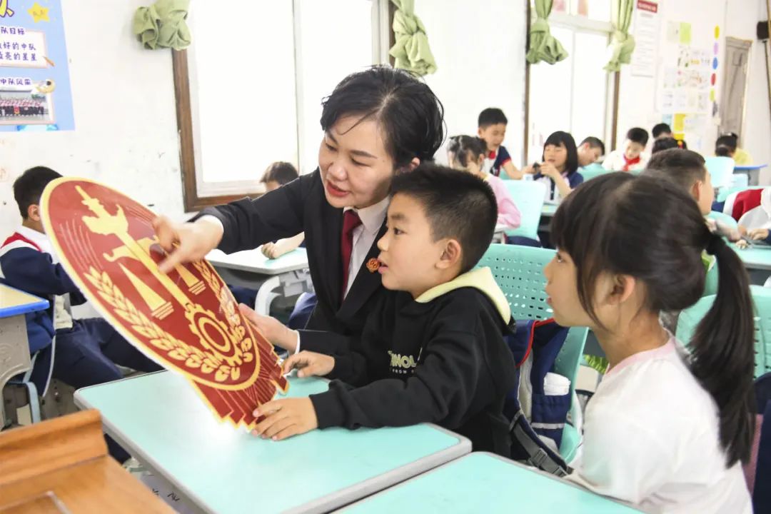 图为干警为学生介绍法徽。(记者 胡佳佳 通讯员 朱鑫玲 摄)