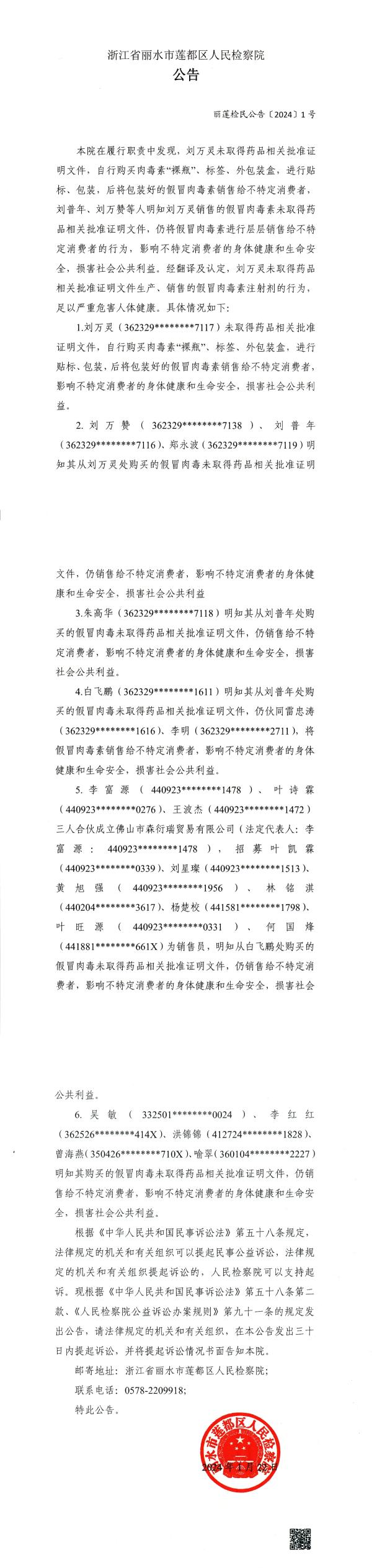3.朱高华(362329********7118)明知其从刘普年处购买的假冒肉毒未取得药品相关批准证明文件,仍销售给不特定消费者,影响不特定消费者的身体健康和生命安全,损害社会公共利益。